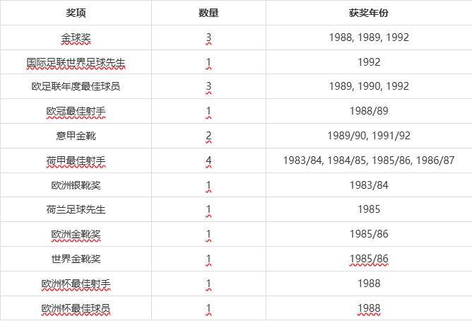 尽管退役较早,这位荷兰球星的个人荣誉数却仅少于梅西和C罗,总计斩获20座奖项。