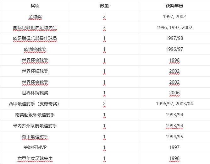 他两次夺得金球奖,第二次是在2002年,他在世界杯决赛上演巅峰表现,帮助巴西2-0击败德国夺冠。