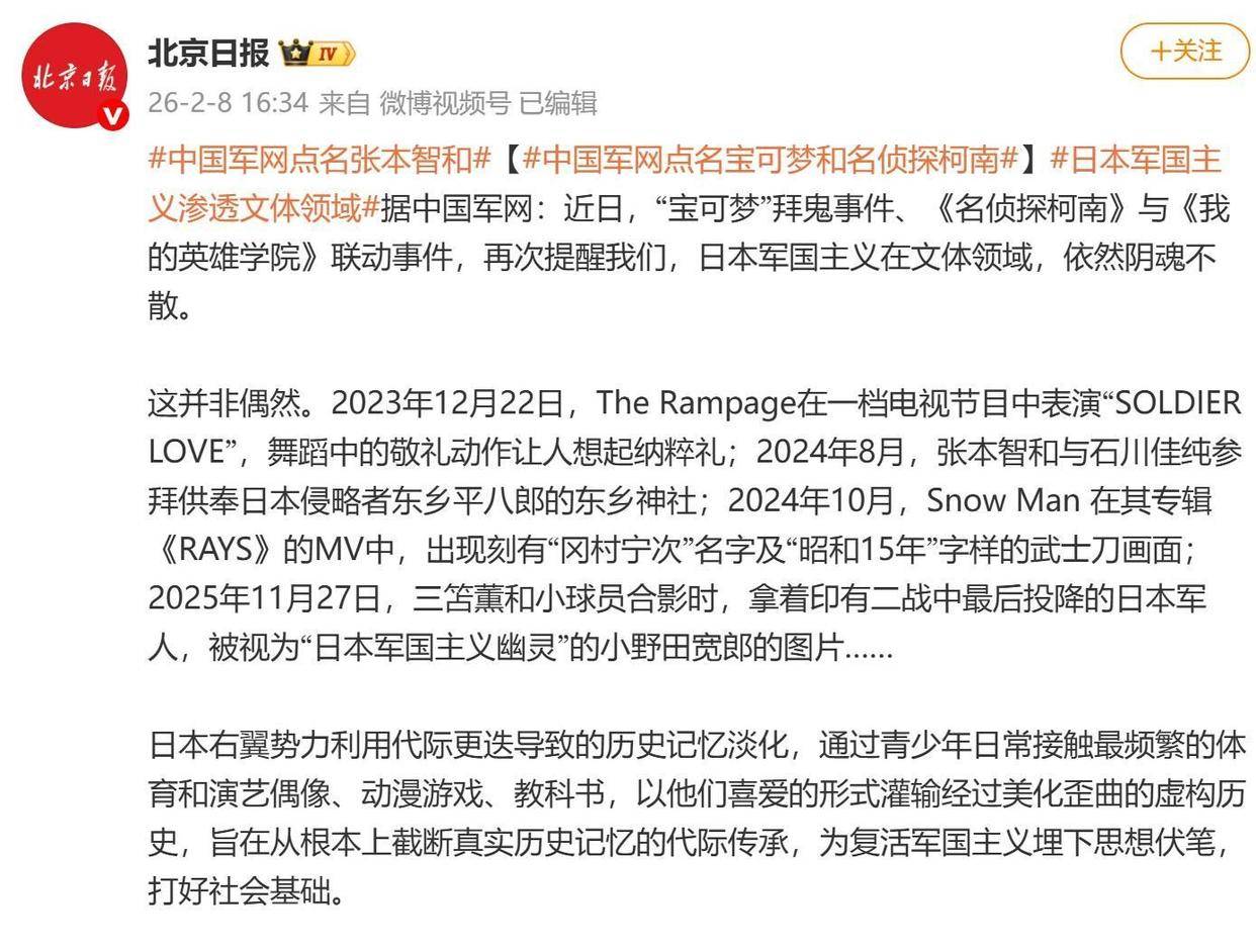 2026年2月8日,海口亚洲杯男单决赛,王楚钦以4-2的比分逆转战胜张本智和,成功夺冠。 就在同一天,中国军网发布警示文章,直接点名张本智和,将他与“宝可梦”、“名侦探柯南”等备受争议的IP并列,直指其背后所潜藏的军国主义渗透风险。