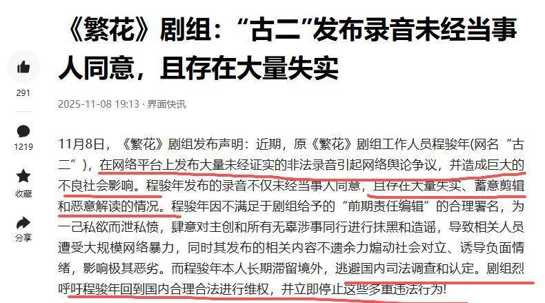 《繁花》剧方已发布声明,称录音内容严重失实,并将追究古二的法律责任。王家卫方面暂未直接回应,而秦雯编剧则反应迅速,表示将坚决用法律武器维护自身权益,显得底气十足。